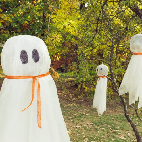 Inflate a bunch of white or clear balloons to different sizes. Attach some fishing line or black thread to each one so you can suspend them from a tree or another object. Drape a piece of white fabric over each balloon. You’ll need to cut a small hole in the centre for the fishing line or thread. Finally, use a thick black marker to draw scary faces on your gang of ghosts.